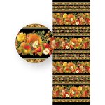 This high-quality designer print features a lovely pumpkin, fruit, and floral arrangement stripe repeat with deep rust, warm gold, and moss green hues enhanced with shining luxe metallic gold accent for a palette so vibrantly realistic that it looks like it came straight from nature.