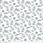 This high-quality fabric features a charming pattern of dreidels and Stars of David in a sophisticated navy hue on crisp white.