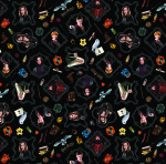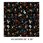 Get ready to conjure up some magical creations, this Harry Potter themed fabric with character portraits and related items on a black background.